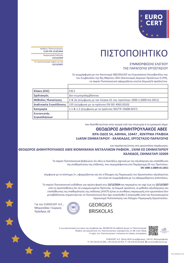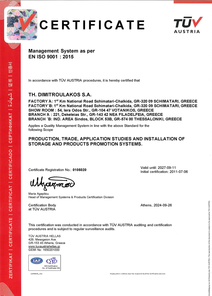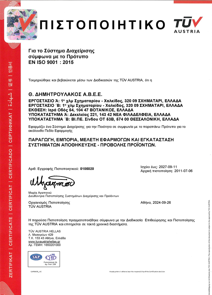 Η εταιρεία Θ. ΔΗΜΗΤΡΟΥΛΑΚΟΣ Α.Β.Ε.Ε έχει πιστοποιηθεί με το πρότυπο EN ISO 9001:2008 για την Παραγωγή, Εμπορία, Μελέτη Εφαρμογών και Εγκατάσταση Συστημάτων Αποθήκευσης – Προβολής Προϊόντων.