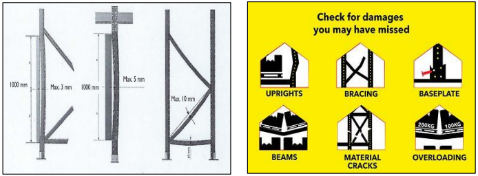 - Τα βασικά στοιχεία ενός ραφιού παλέτας αποτελούνται από τα πλαίσια (κάθετα στοιχεία με εσωτερική δικτύωση και πάκτωση στο δάπεδο), τις δοκίδες (εκεί που τοποθετούνται οι παλέτες) και τα βοηθητικά εξαρτήματα (προφυλακτήρες, χιαστί κ.ά.). Επίσης, παρατηρήστε για τυχόν ρωγμές στο έδαφος λόγω αυξημένων σημειακών φορτίων. Πριν την έναρξη κάθε βάρδιας ελέγξτε οπτικά για τυχόν αλλοιώσεις και αν τις βρείτε σημαντικές, ενημερώστε τον υπεύθυνο, αποφορτώστε το σύστημα και φροντίστε για την αποκατάστασή του. Κάποιες ενδεικτικές μετρήσεις μπορείτε να δείτε στις παρακάτω φωτογραφίες.